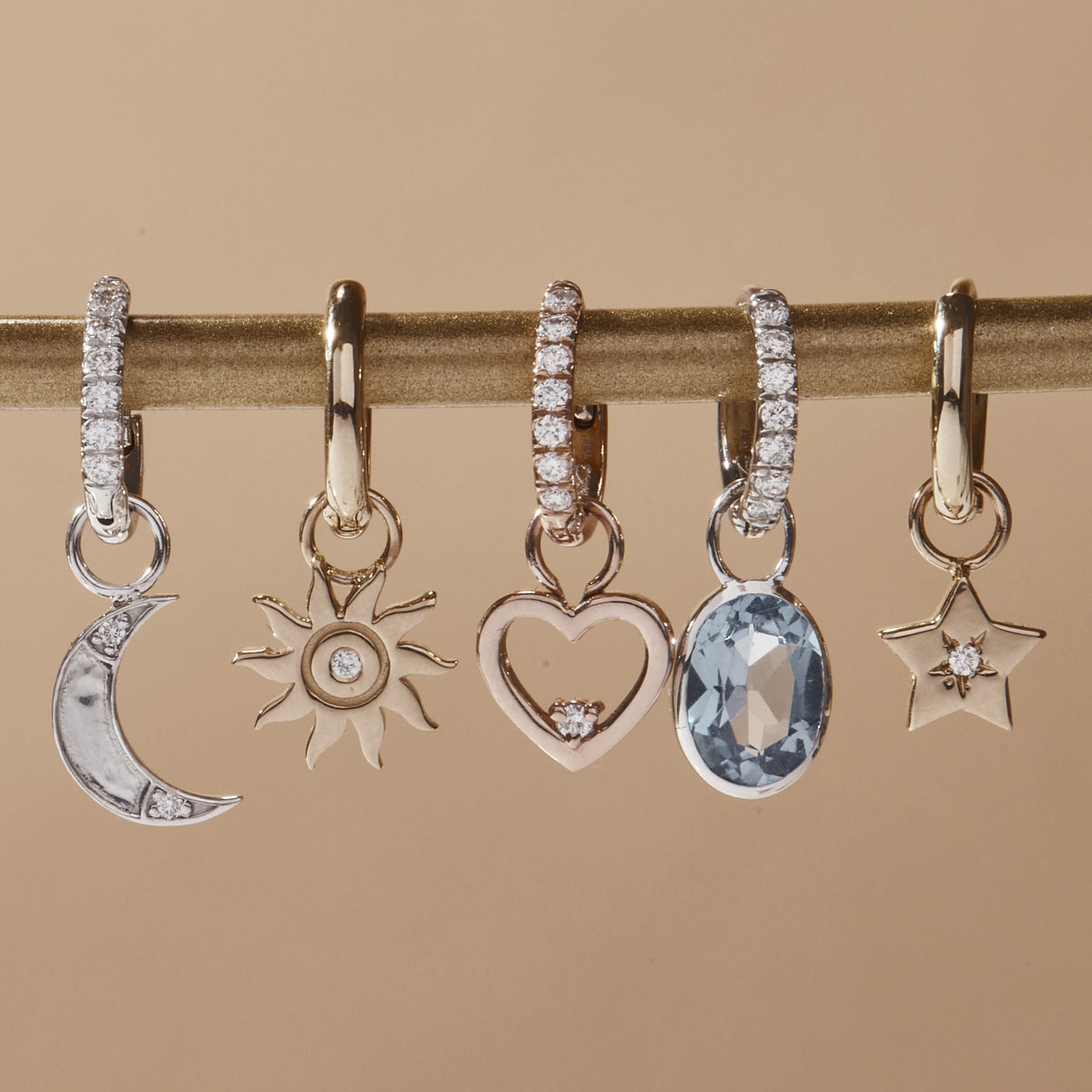 Small but mighty, huggie hoops have had a huge year, and we are loving it. It’s a great honor to launch an earring both in sync with the times, yet timeless. With countless ways to customize, these huggie hoops are intended to tell your story. Choose your desired 14k gold motif to suspend from a solid or diamond studded yellow, rose, or white gold hoop. Mix, match, and stack: You’re well on your way to speaking your truth.