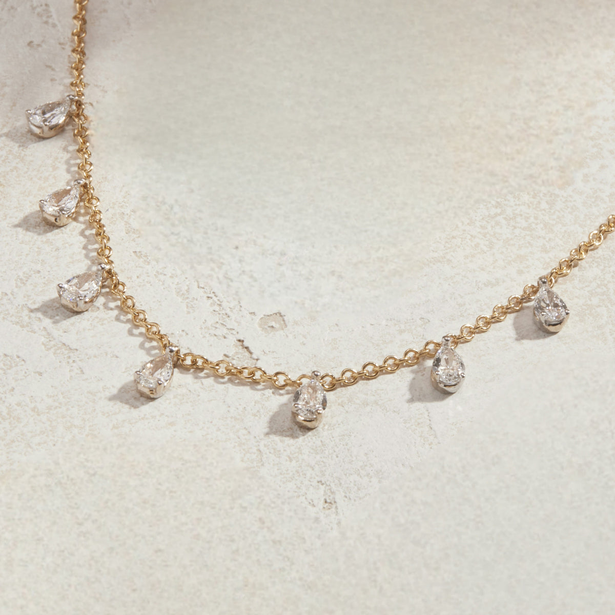 Ultra feminine pear shaped diamonds are suspended from an adjustable 18k gold chain, creating a look that’s both modern and classic.